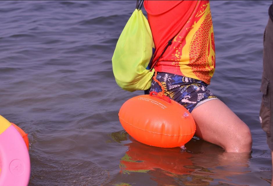 “跟屁虫”这种救生浮球是国际泳联和中国泳协指定的救生设备,采用了双气囊的设计,不会影响游泳者游泳,而且比救生圈安全。