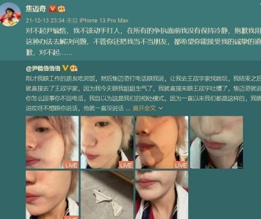 近期,焦迈奇被尹毓恪曝出动手打人,尹毓恪还晒出了自己被焦迈奇打伤的照片,据尹毓恪发文称,当时焦迈奇、尹毓恪和王欣宇三个人在王欣宇家,由于当天焦迈奇之前和薛明媛有些不愉快,心情不好。