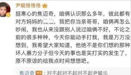 而且尹毓恪在焦迈奇道歉后,还说自己挺寒心的,彼此都有对方妈妈的联系方式,一直把焦迈奇当做亲哥哥,如今打人太寒心,原不原谅的还是先考虑一下。