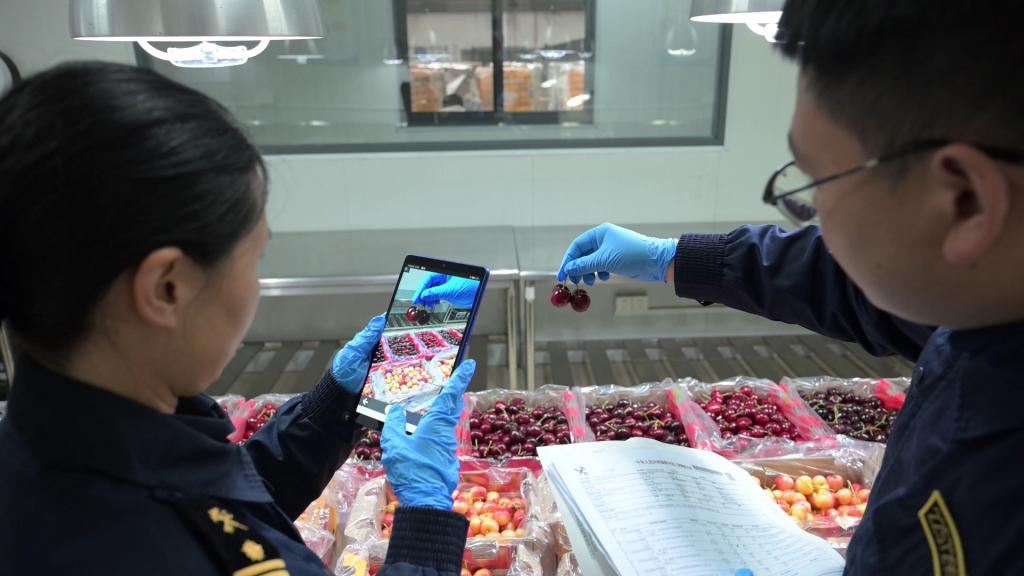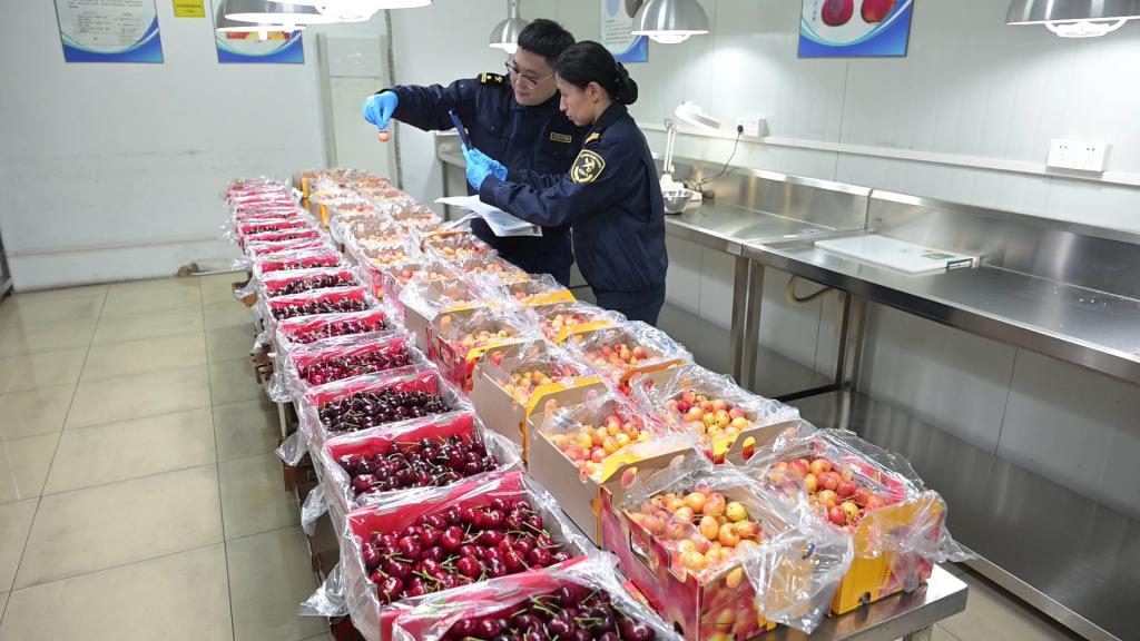 上海浦东国际机场海关物控查检一处查验七科副科长李大陆介绍:" 针对鲜樱桃易腐易烂、旺季包机频次密、进口量大等特点,我们开通了智利车厘子包机绿色通道,提前了解包机入境计划,制定‘一机一策’保障预案,确保即到即查、即检即放。在保障快速通关的同时,我们也开展了植物检疫和农药农残等有毒有害物质检测,确保国门生物安全和食用农产品质量安全。"