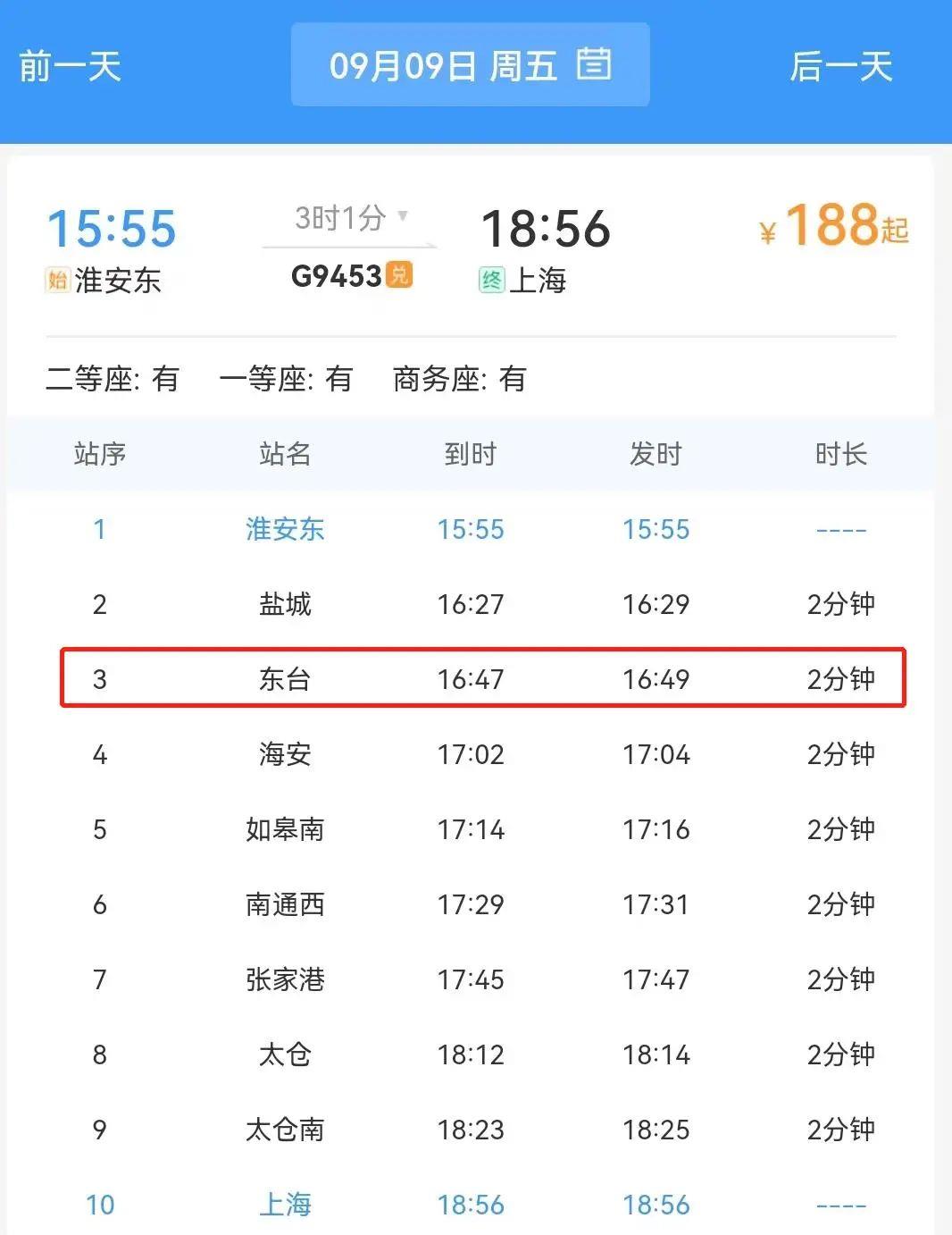 (3)淮安东-上海G9453没有变化。经由沪苏通线、盐通高速线、徐盐高速线运行。