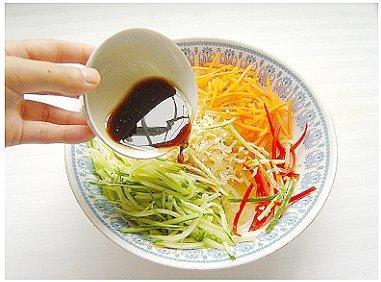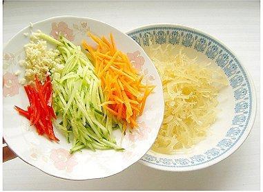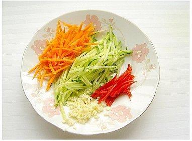 第三步:把黄瓜、胡萝卜刨成丝,红椒切丝,大蒜切末。放入冰箱冷藏10分钟.