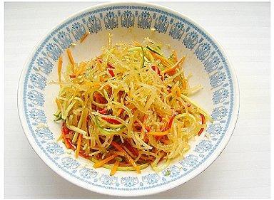 第四步:把黄瓜、胡萝卜、红椒、大蒜放入龙须菜中。