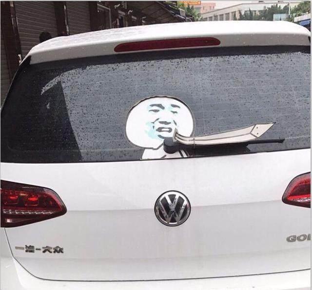 这辆高尔夫上贴了一个很火的表情包,此处应配上“不服,放学后在校门口等你”,真是有意思。