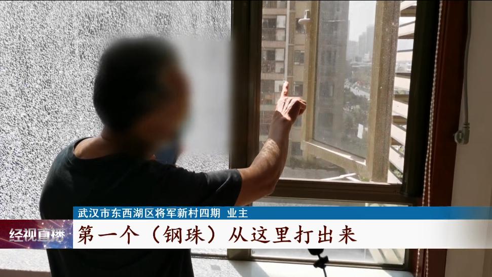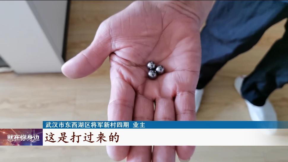 武汉市东西湖区将军新村四期业主说 :" 第一颗钢珠从这里打进来,掉到房间地板上,我找到一颗,外面打得砰砰响。"