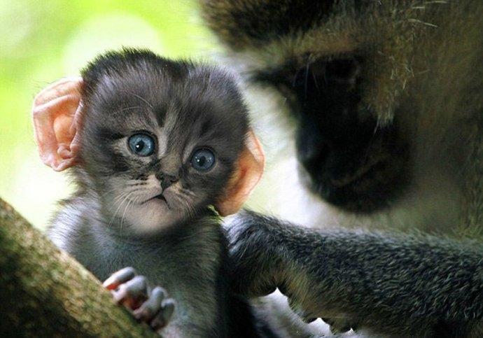 其实这只杂交的“猫猴”其实不是真实存在的,它是由美国一位名叫Sarah Lee DeRememer创作出来的,DeRememer表示,他花费了花费数小时将猫咪的脸PS到了小猴子的头上,创造了这个“猫猴”。