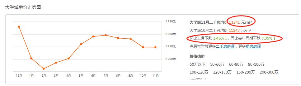 二手房市场波动较大,现在大学城二手房价格虽然比今年2月有所上涨,但是同比去年还是有非常明显的跌幅。