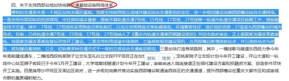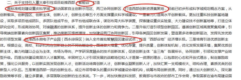 看完这段文字,我看到了重庆对于打造以大学城为核心的西部槽谷的决心。文件中还重点通过三个方面来打造西部核心: