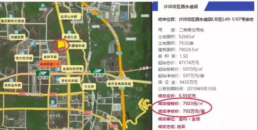 2018年沙坪坝区方向供应主力在西永方向,一共有9块地入市,2019年9月中旬,大西片区两块土地仅相隔一周双双土拍出手,分别由龙湖+香港置地以5534元/㎡,金辉+金科以7023元/㎡拿下。