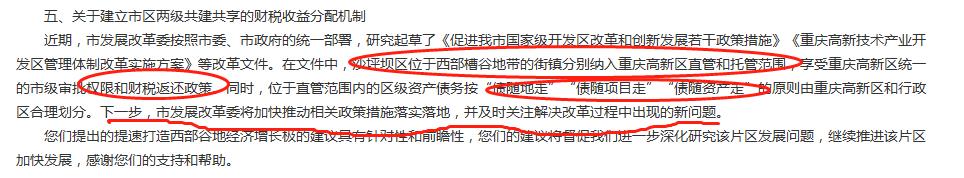 今天我就查到了一个重要消息,颠覆了我的判断,在重庆发改委的官网上2019年10.31号最新回复函件,《关于提速打造西部谷地经济增长极的建议》正式得到了发改委的回复,在整篇回复函件里面,我看见大学城未来巨大的发展机会。