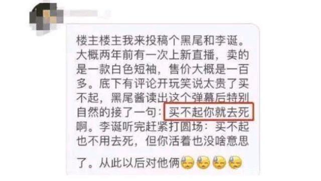 在李诞的一次直播中,因为黑尾酱的一次失言,人品又一次遭到了网友的质疑,起因是李诞在直播带货售卖一款白色短袖,而在弹幕中有网友表示太贵了买不起,没曾想黑尾酱很自然的接了一句:“买不起你就去死啊”。李诞听后也是急忙救场对这位网友进行调侃:“买不起也不用去死,但你活着也没啥意思了”。