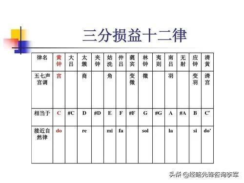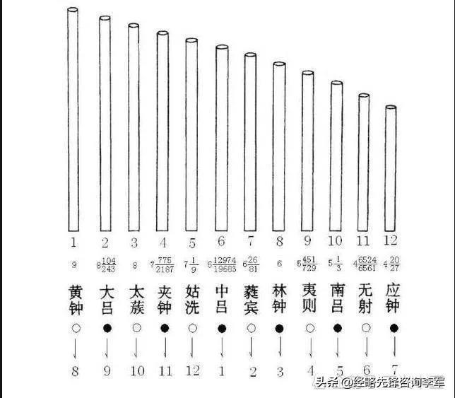 律管的长度是固定的。长管发音低,短管发音高。十二律相生的三分损益法,十二个律管的长度有一定的比例,这意味着十二个标准音的音高有一定的比例。