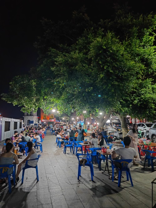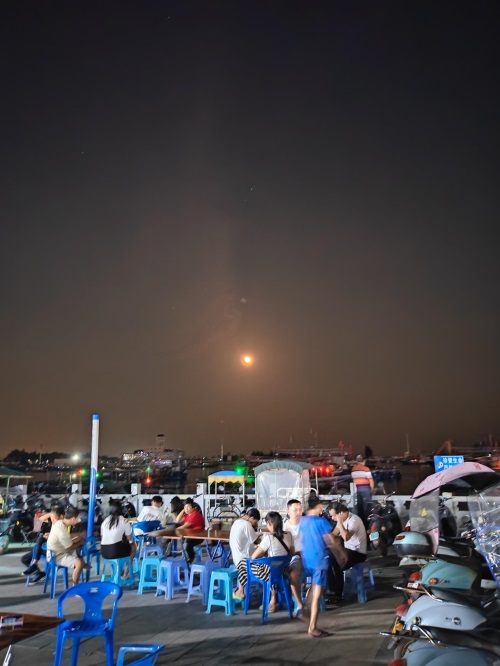 广场上摆满了四方小桌,坐满了热爱夜生活的人们,分不清是本地人还是外地人。他们热情的讨论着,不停地捋着被海风吹乱的头发。海上一轮圆月已升上天空。