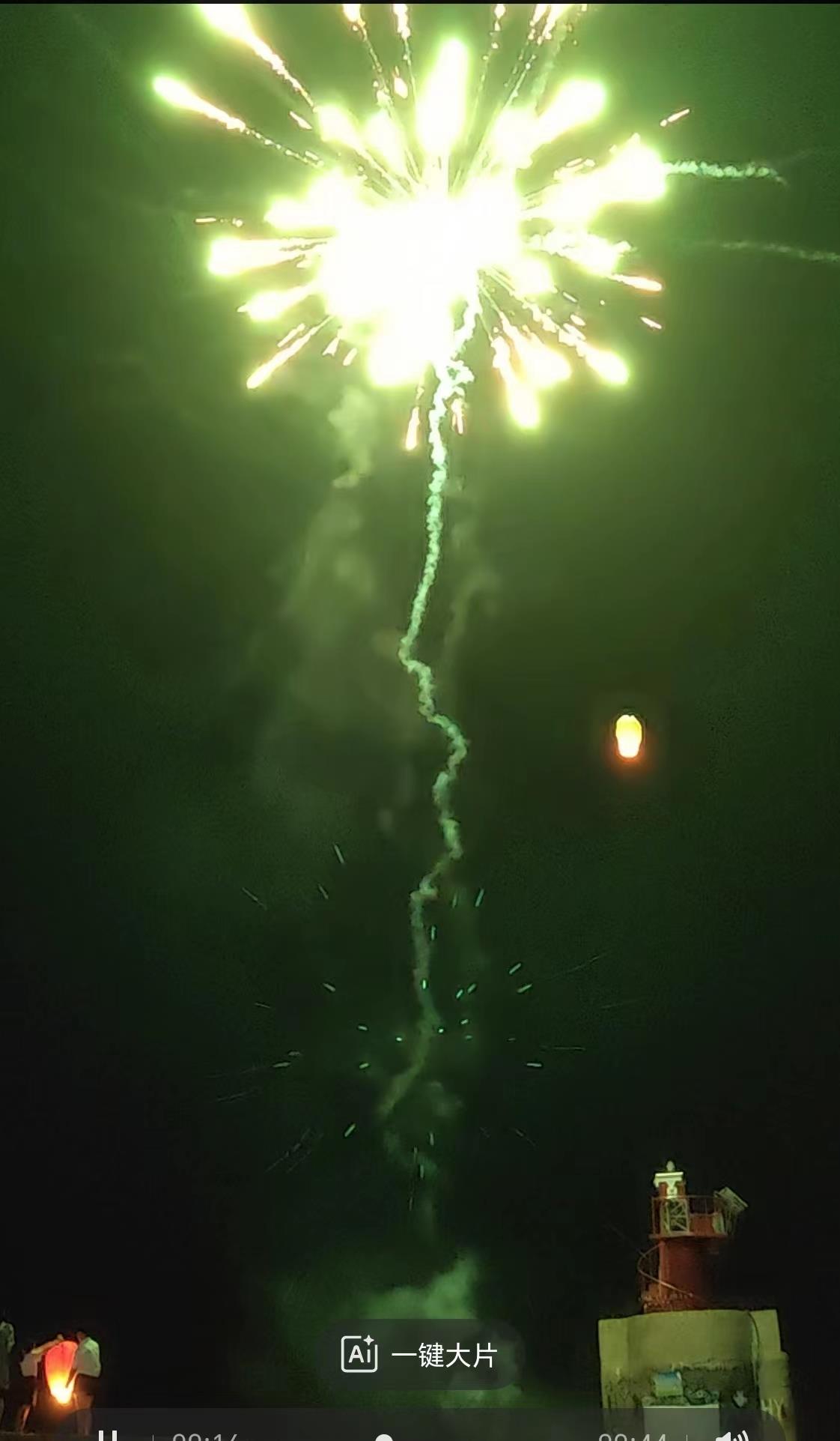 堤坝上突然让放起了烟花,旁边还有人在放孔明灯。