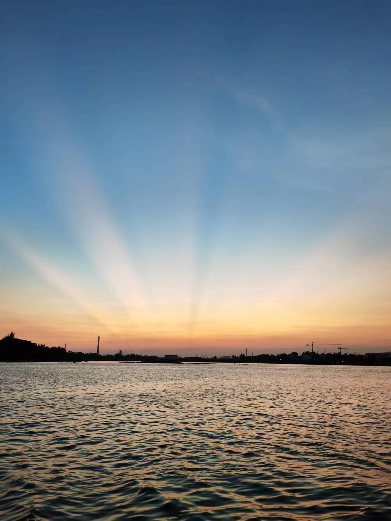 很幸运的是,在沙堤,我们遇到了最美的夕阳和晚霞,特别是霞光像射线一样,射向天空。许多人,面向霞光、背对镜头,来了一张背影照,定格这美好瞬间。