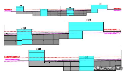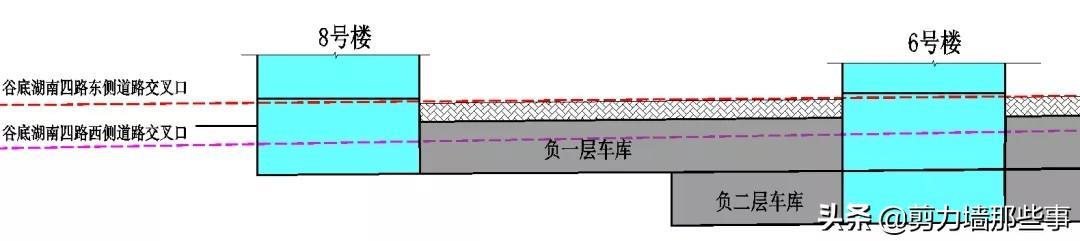 △地下室剖面图(红色为场地右侧道路标高线,洋红色为场地左侧标高线)
