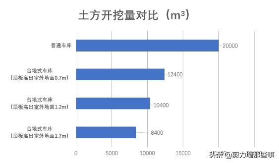 通过以下数据分析,假设全埋式地库开挖量为20000立方,台地式地库顶板高出室外地面0.7米,1.2米,1.7米时,分别可以少开挖7600立方、9600立方、11600立方。
