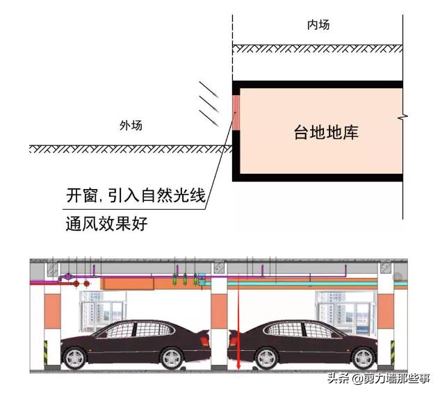 由于山地地势本身存在高差,可以利用高差将侧窗设置于地下车库的侧壁,从而达到引入自然光的目的。这种方式类似于一般建筑的开窗,构造简单,布置方便,在设置时应考虑窗地比、照度等条件,以及地下车库的内部布置形式,调整侧窗的位置及大小,从而提高自然采光的效率。地库侧墙变外墙,可以实现自然采光、自然通风。