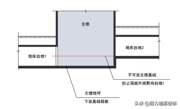 台地式地库底板应与主楼地下室底板做平,若存在实际困难,则主楼标高需按相邻台地较低侧标高设置,局部采用回填调整标高,避免主楼筏板外挑影响地库车位布置。