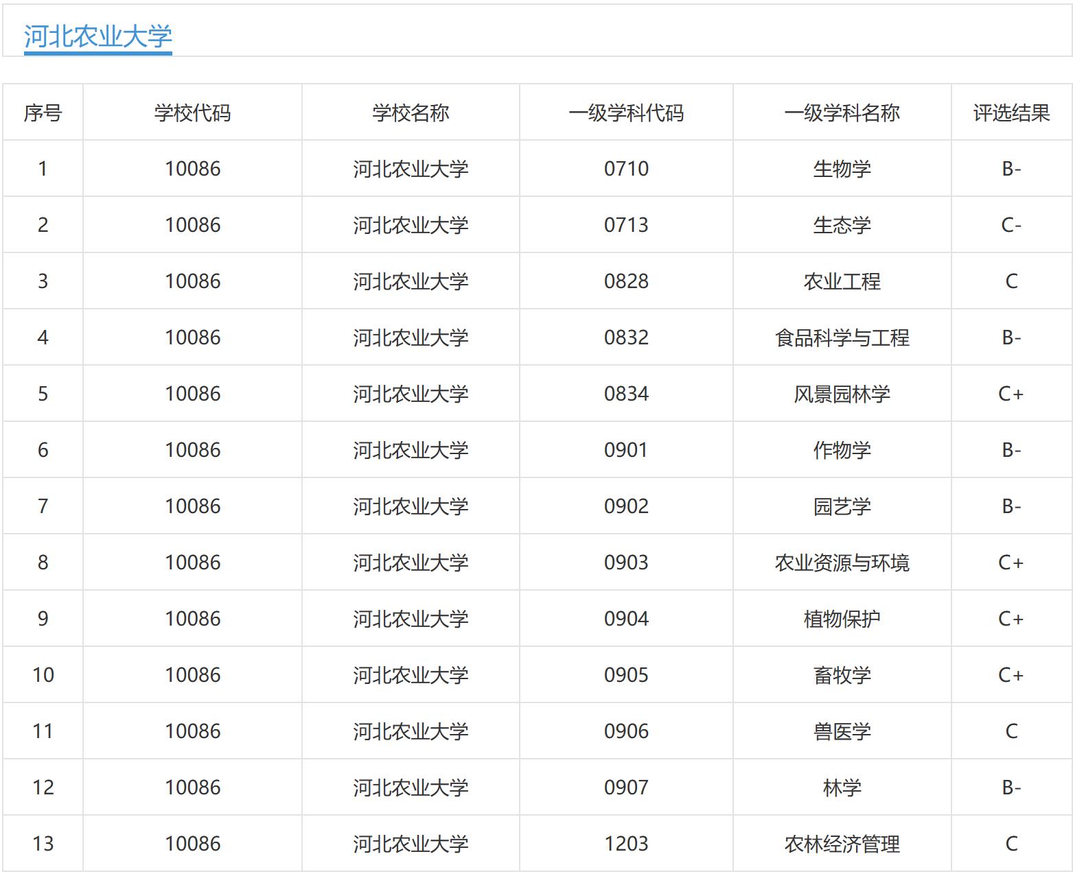 作为一所老牌农业院校,河北农业大学现有8个博士后科研流动站;11个一级学科博士点,1个专业学位博士点;24个一级学科硕士点,12个专业学位硕士点。1个学科列入河北省世界一流学科建设序列,3个学科列入河北省国家一流学科建设序列;有1个国家重点(培育)学科,3个部级重点学科,4个河北省强势特色学科,16个河北省重点学科;农业科学、植物与动物科学2个学科进入ESI全球排名前1%。第四轮学科评估结果如下: