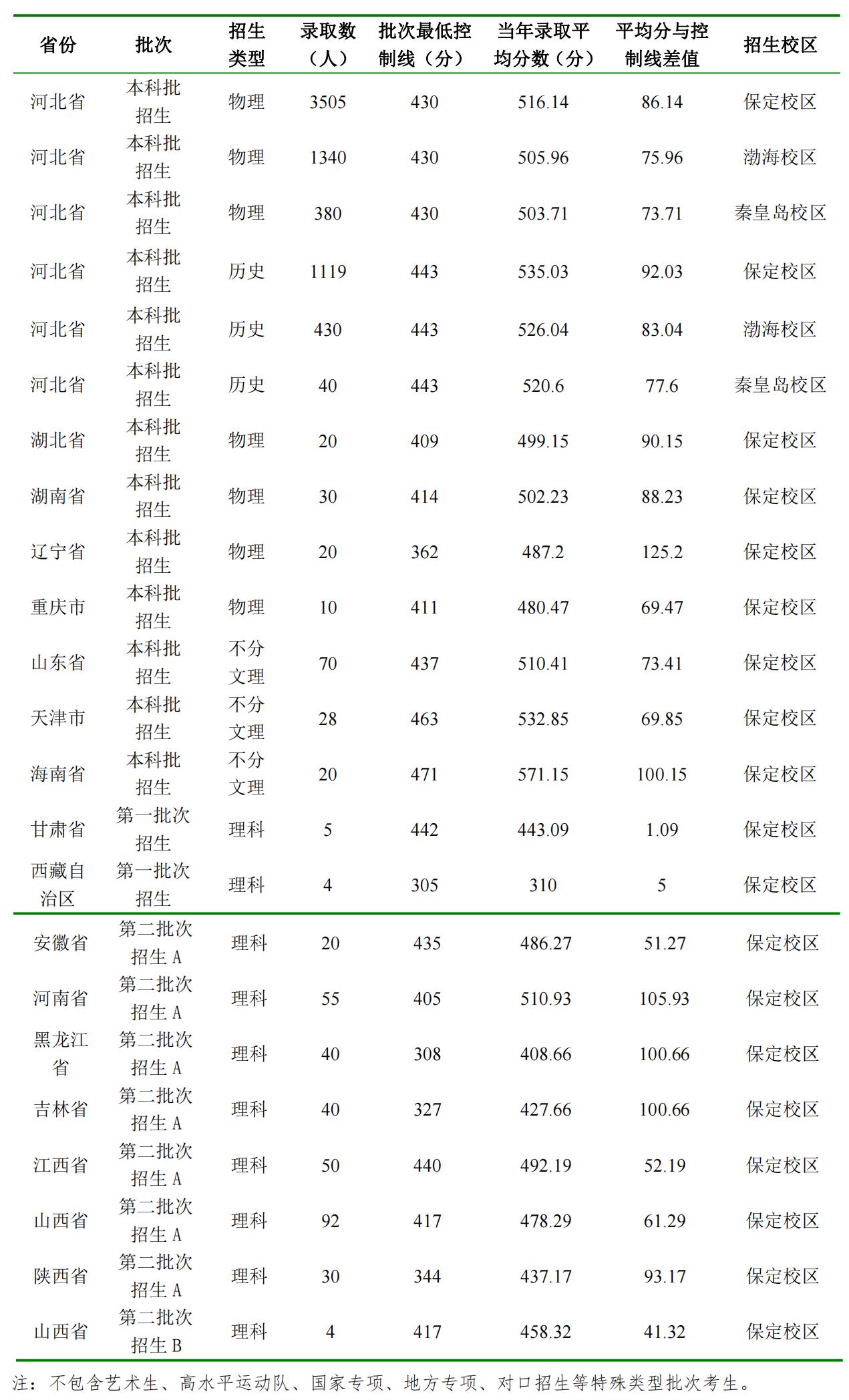 2022 年河北省普通类本科批历史科控制线为 443 分,物理科控制线为430 分。该校普通类本科批录取情况:保定校区录取 4,624 人,历史科录取平均分 535.03 分,物理科录取平均分 516.14 分;渤海校区录取 1,770 人,历史科录取平均分 526.04 分,物理科录取平均分 505.96 分;秦皇岛校区录取 420 人,历史科录取平均分 520.6 分,物理科录取平均分 503.71 分。河北农业大学2022年面向河北省招生各专业(类)录取情况统计如下:
