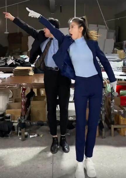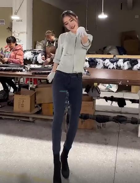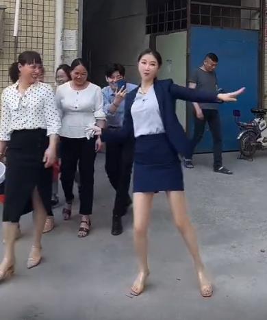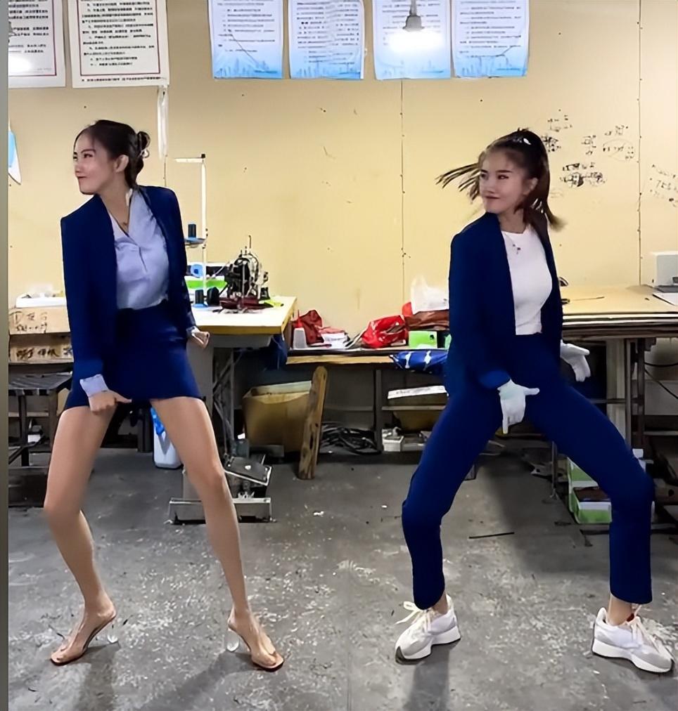 一件衬衫加休闲西装,穿上紧身裤超短裙,脚上再踩上一双恨天高,美女形象再配上曼妙的舞姿,也和工厂车间的背景形成了强烈对比,而这种视觉冲击力,也让笑笑直接火出了圈。