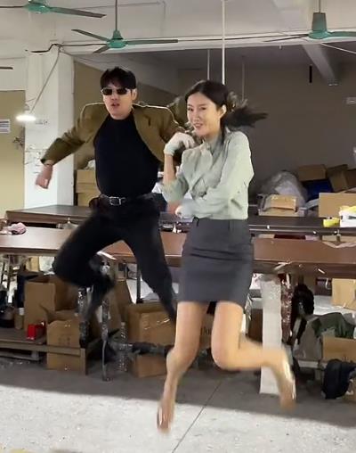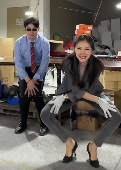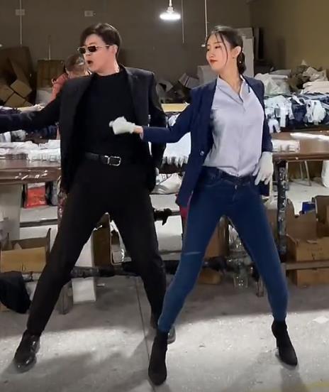 不仅如此,大笑笑还会经常拉着厂长一起跳舞,只见厂长戴着墨镜一身西装,俊男靓女的形象更是十分吸引眼球。