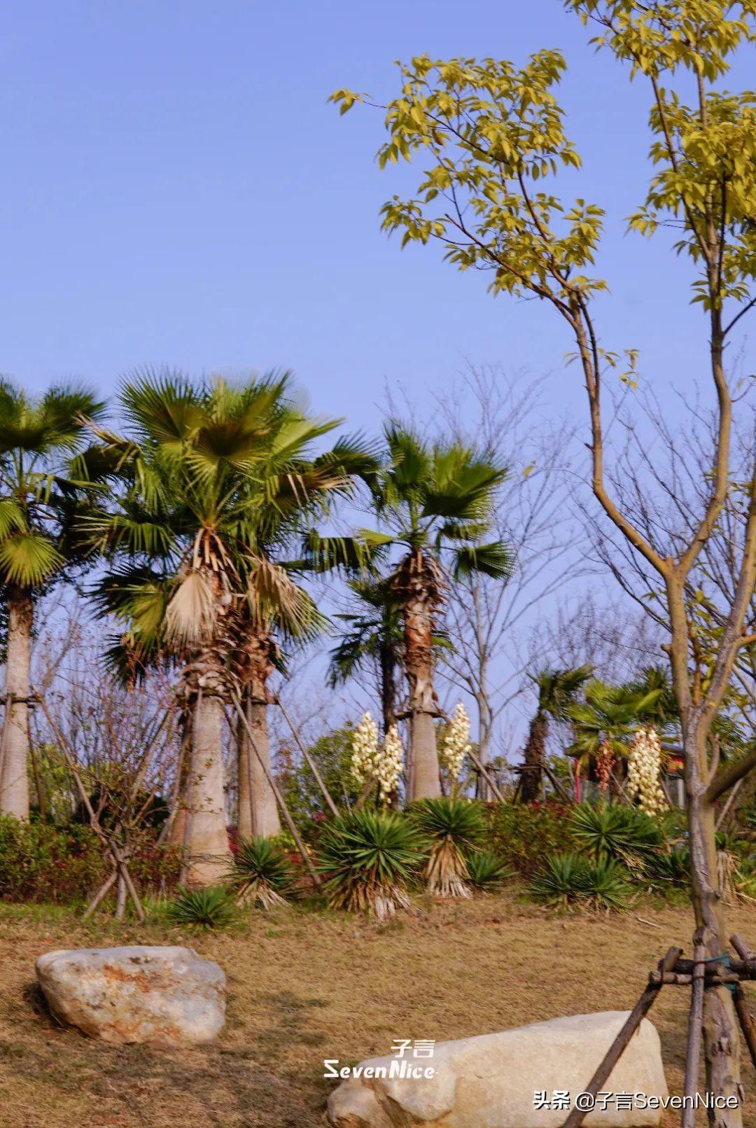 这里有约2万平方米的沙滩区,分布着假山、密林,还有一棵棵椰树、棕榈树郁郁葱葱,宽阔的湖面在阳光下波光粼粼。