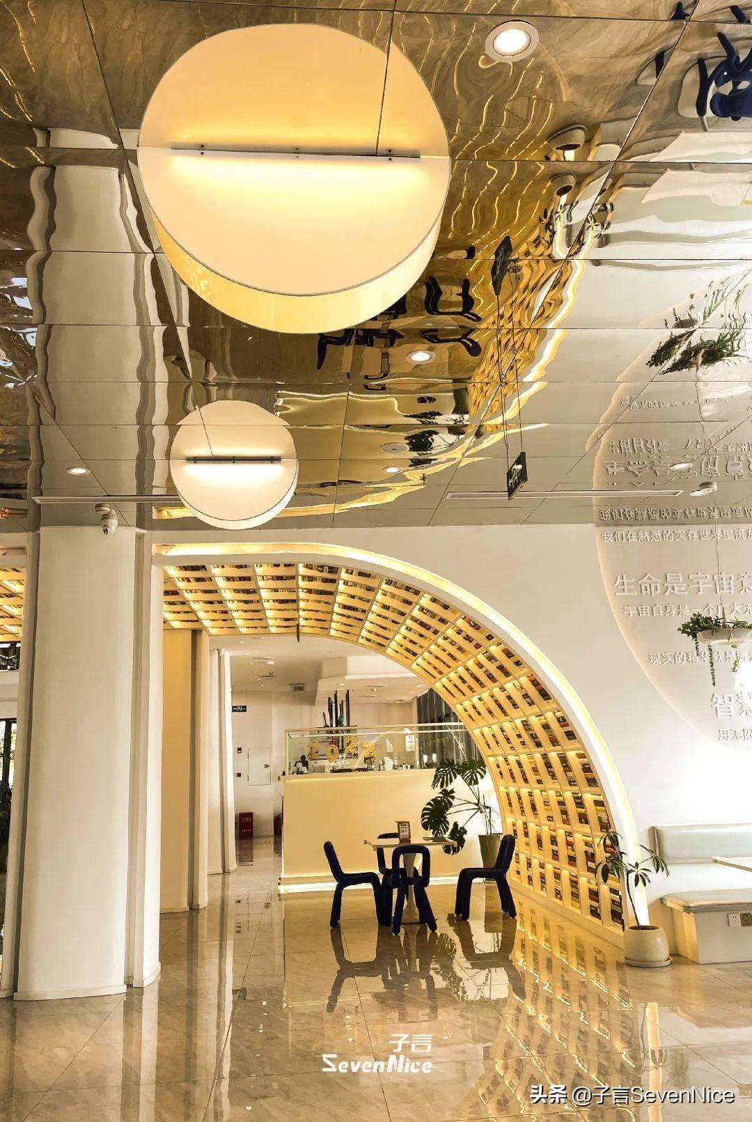 优美的线条,科技感油然而生。书店的顶部采用了银色反光材质装饰,倒映在地板上显得更加亮堂。