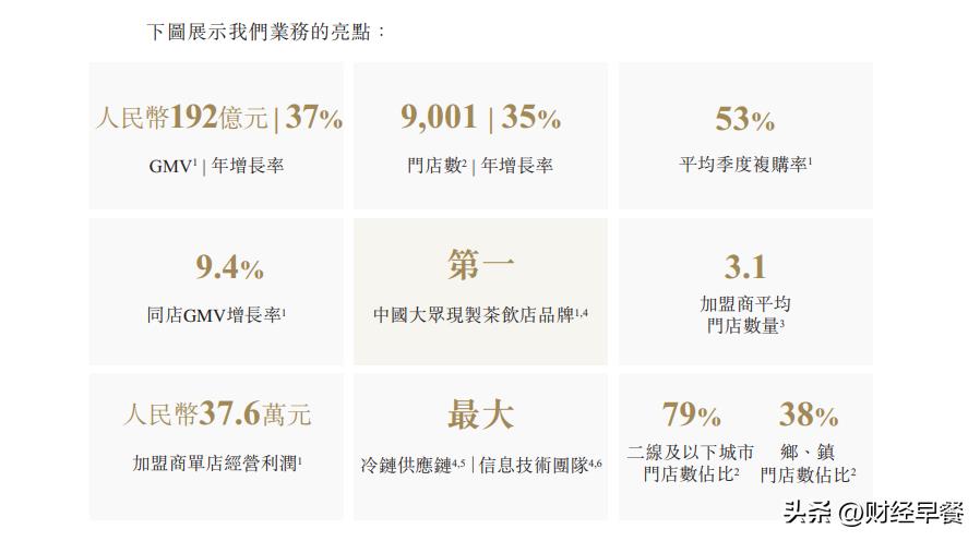 根据灼识咨询报告,同期中国大众现制茶饮店市场的估计单店经营利润率约为10%-15%。特别是在四线及以下城市,于2023年,加盟商单店经营利润为38.6万元,为该类地区2022年年度人均可支配收入的逾10倍。