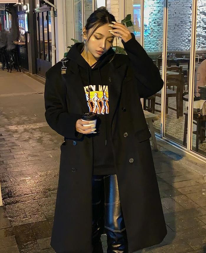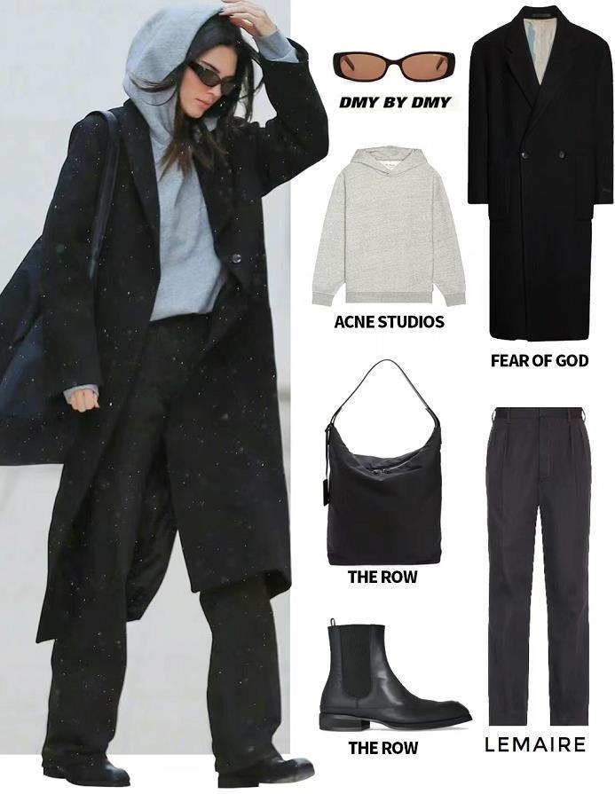 黑色大衣+黑色连帽卫衣,自带酷感又帅气。