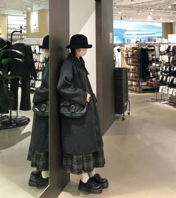 黑色大衣+绿色格子半身长裙,遵循一简一繁的组合,真的很时髦好看,出门的时候佩戴一顶帽子,既点缀了整个造型时髦度,又保暖。