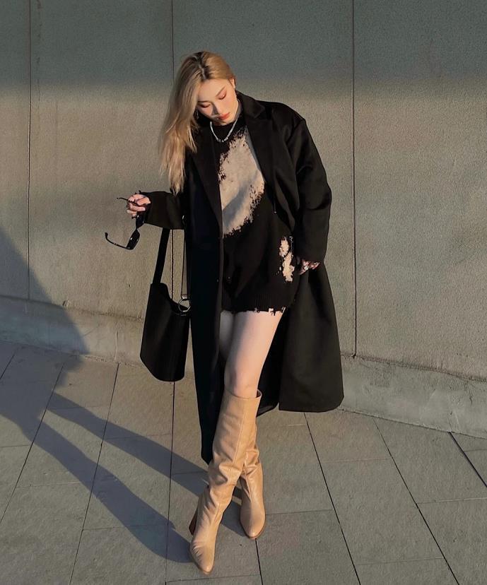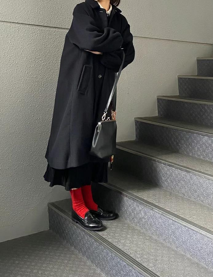 冬日必备的黑色大衣,感觉在很多姐妹们的衣橱里都会有,选择黑色半身长裙,看起来就很显瘦。