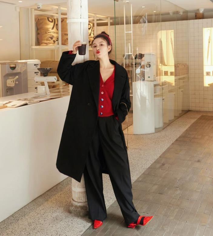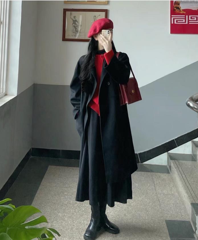 红色配黑色,真的是很复古经典的搭配了,黑色大衣+红色毛衣,下装也是选择了黑色半身长裙,与黑色长靴一致,不仅显瘦还拉长腿部比例。