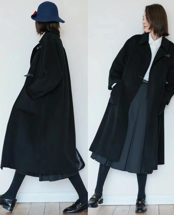30+上班穿什么?可以试试黑色大衣+百褶半身裙,牛角扣点缀的大衣,自带复古气息,既减龄又不失气质感。