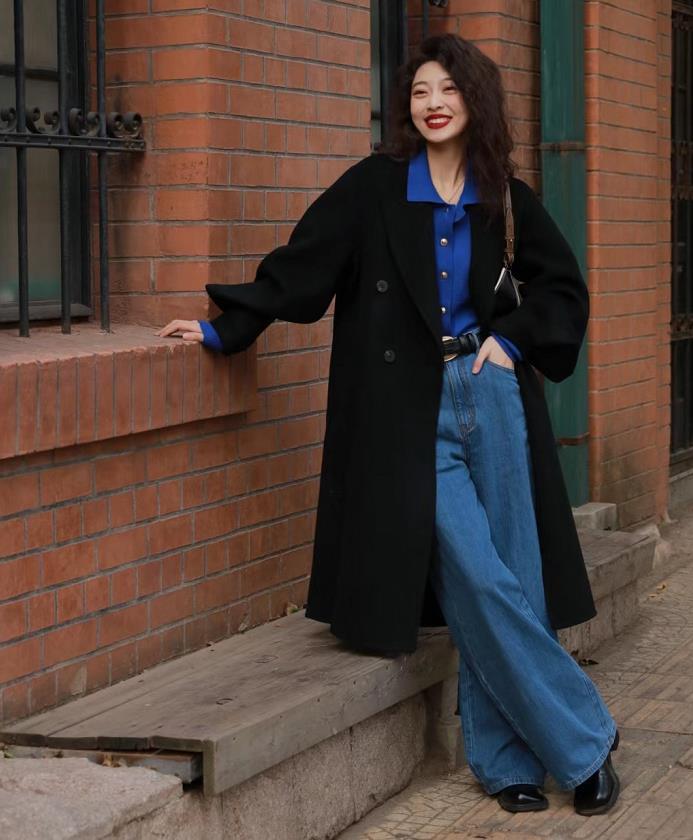 黑色大衣+克莱因蓝内搭,下装是一条休闲阔腿牛仔裤,这么显随性又有范的搭配,相信很多姐妹看了都会很喜欢吧?