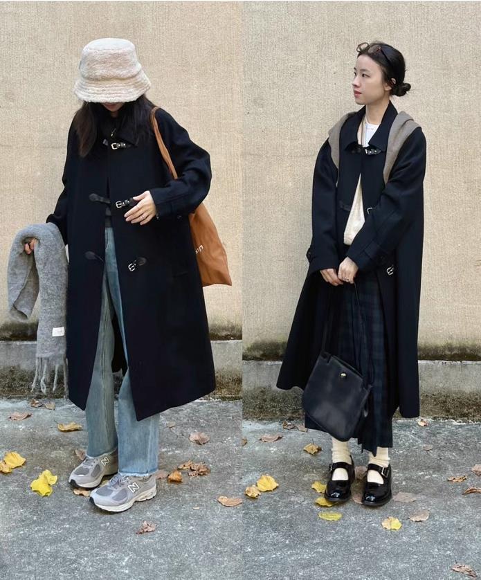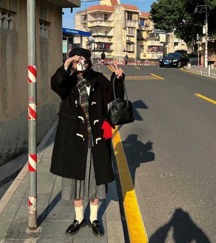 秋冬就是少不了一件牛角扣大衣,黑色的牛角扣大衣,很经典百搭的款,搭配百褶裙,学院风满满。