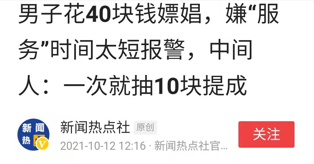 嫖娼时因嫌弃服务时间太短,选择愤怒报警的男人有太多了。还有一男子花了40元钱嫖娼,他觉得对方给自己服务的时间太短了,最终也是选择的报警,让“叔叔”来给“评理”。