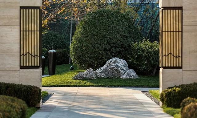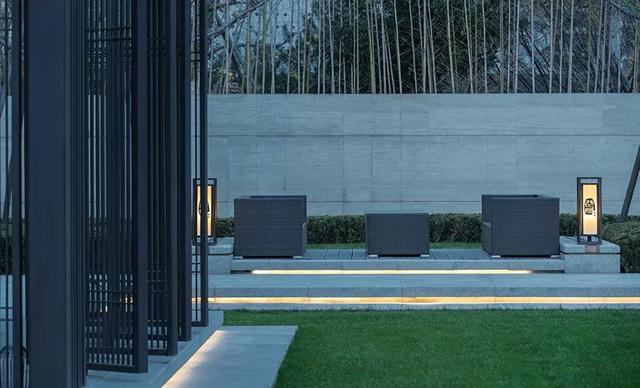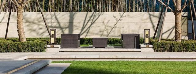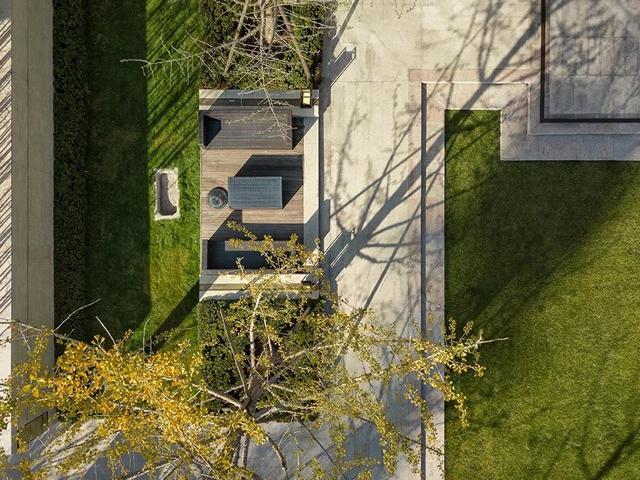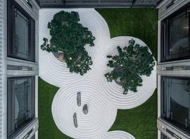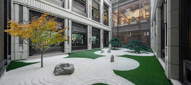下沉庭院景观设计效法“一池三山”造园模式,其点睛之笔是崛围红叶色。一树崛围红叶,两棵松柏长青,细碎白石铺成太液池,黑石一摆就是三座仙山。空间一旦有了颜色,就如同河床有了清流,置身其中能真切地感受到与生命、自然的互动。