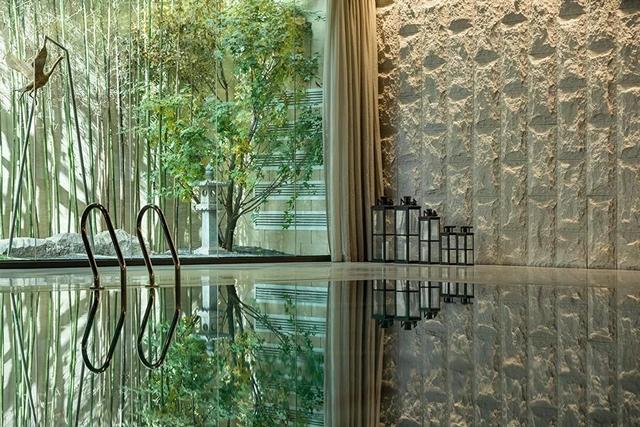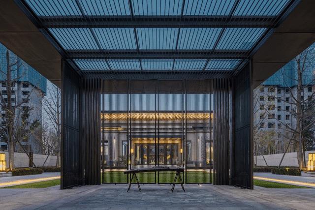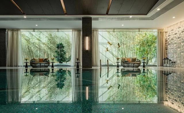 双塔凌霄,又称文笔双峰,像一双孪生姊妹,每当晨光初照,影子投射到文瀛湖中,人曰:双毫蘸墨,文运兴矣。泳池景观设计得其“并”趣,两窗景致和而不同,在天光的映照下,幽幽树影漾漾清波,古趣消融在现代场景设计中,呈现出符合现代人审美的景象。