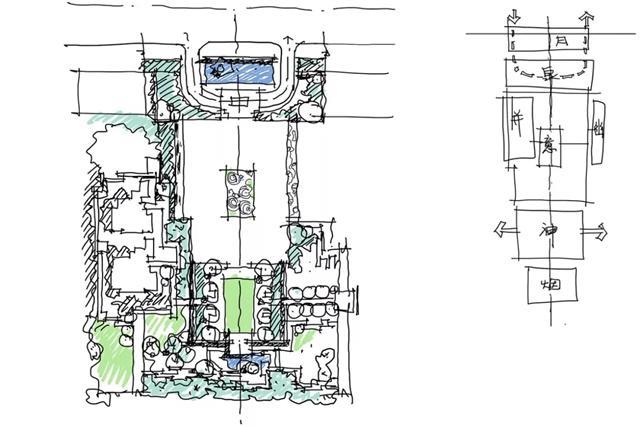 土堂怪柏是大自然的杰作。生长在崖巅的柏,其神倔强,其质干皱;生长在净因寺殿后的柏,粗壮高大,群冠结翠;同生佛地,一癯一丰,体态迥异,暗含道意。后场空间的植栽,效法怪柏之神,相对而生,阴平阳秘,相互守望,尽人情,合天理。