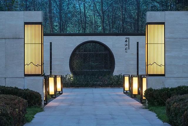 生活在喧闹的都市里,更需要一种清冷的情致。入口景观墙设计灵感得自蒙山晓月,正面以石鼓洞祥云为图样,在入口铺装石材雕刻,嵌于地面;背面明月以松作饰,地面水景以星星灯映衬;白璧无瑕安卧于星空之上,遗世而独立,清辉澹水木。