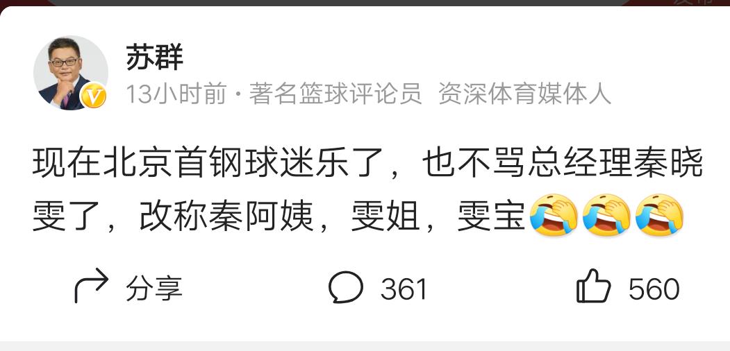 今年夏天,一系列神操作让不少球迷迅速转变,纷纷点赞。正如篮球解说苏群而言,现在北京首钢球迷乐了,也不骂总经理秦晓雯了,改称秦阿姨、雯姐、雯宝。