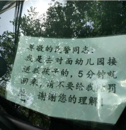 民警在对违停车辆开具罚单过程中,发现其中一辆小客车的车主在挡风玻璃右下角留有一张卡片,上写着:“尊敬的民警同志,我是去对面幼儿园送孩子上学的,5分钟就回来,请不要给我贴罚单,谢谢!”