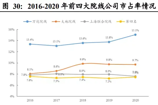 这里说明一点的是,院线跟影院的区别在于:影院主要是对接终端客户的,也就是我们平常去看电影的场所;而院线是拥有影片分发资质牌照的(目前国内有牌照只有48家,其中票房不足5亿元的院线多达26条),起到的作用是对旗下的影院或者签约加盟的影院统一管理排片及供片的机构,一部电影的票房除了口碑外,院线的支持也是票房获胜很客观的因素之一。