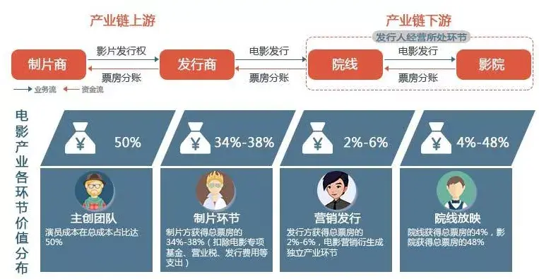 电影行业产业链主要分为上游制片商,像中影集团、华谊兄弟、光线传媒等;中游发行商,像中国电影集团、猫眼、淘票票等;下游为院线、影院。