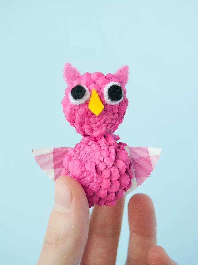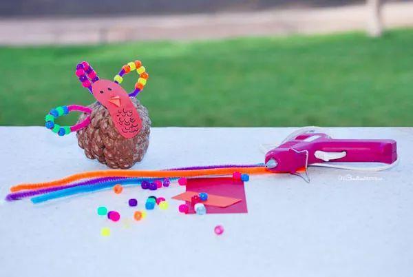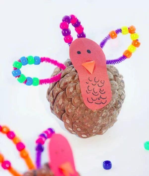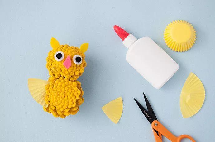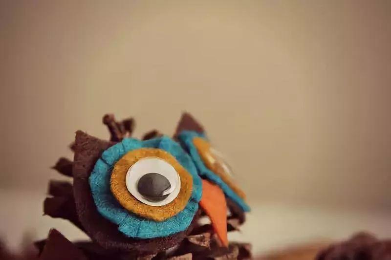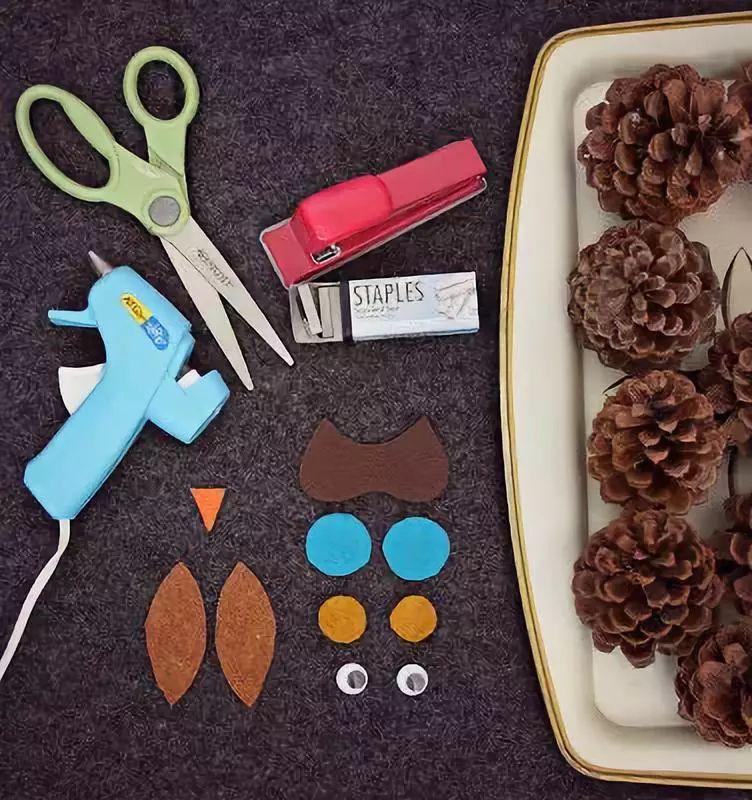 例如,只需要准备一些松果、丙烯颜料、万能眼睛等
