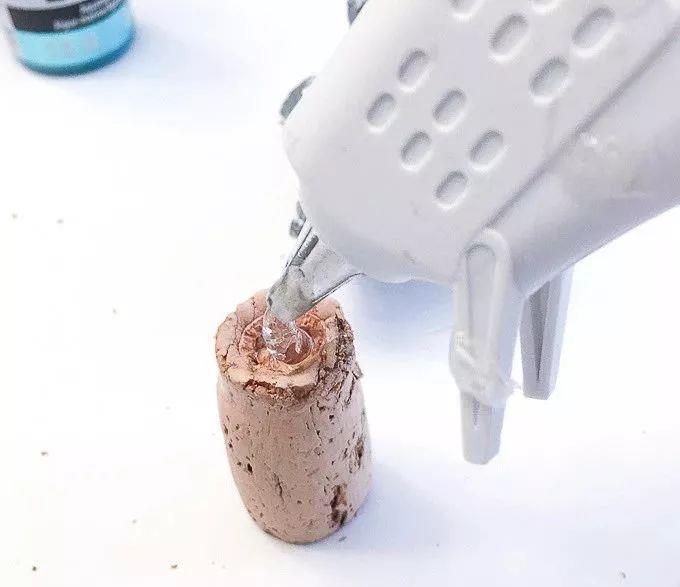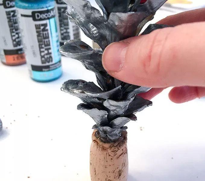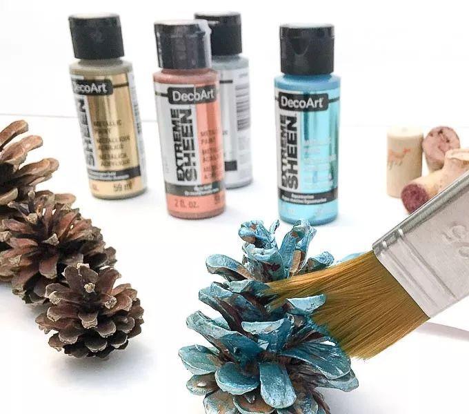 用笔刷沾满颜料后将松果涂满喜爱的颜色