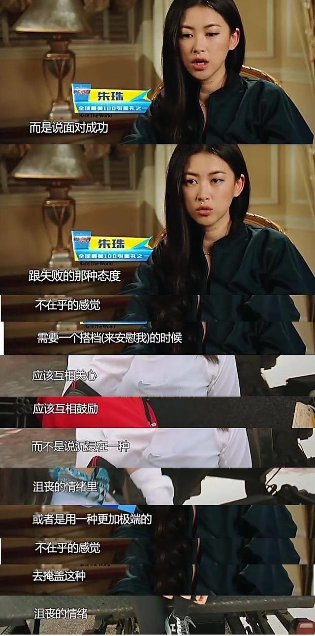同样面对队友的冷漠朱珠是这样说的:“我其实是有些失望,我失望的不是说我们失败,而是说你面对成功或者失败的态度,我受伤的时候其实是需要一个搭档的时候,但是这个时候他站的特别远。我觉得这个时候应该互相鼓励,而不是沮丧。”