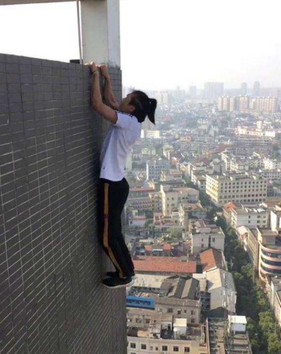 完成各项准备工作之后,吴永宁攀着62楼楼顶的墙边,连着做了两个引体向上,或许是一开始的尝试耗尽了他的体力,之后他竭尽全力想爬上去。